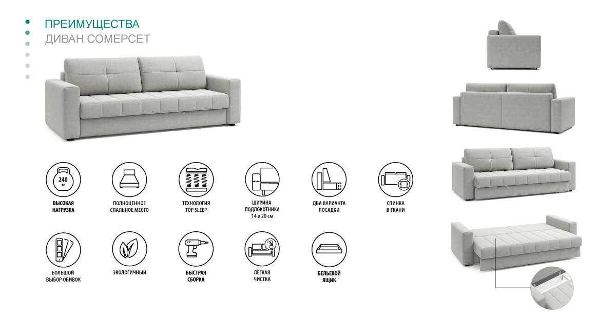 Сомерсет - это технологичное решение для тех, кто ценит комфорт и практичность. Благодаря инновационной технологии Top Sleep, позаимствованной из производства профессиональных матрасов, вы получаете непревзойденный уровень комфорта.